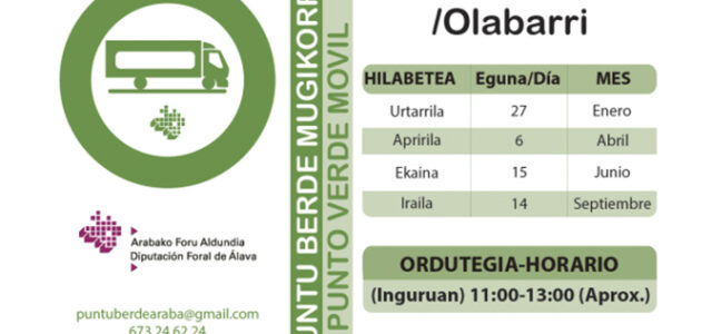 El próximo sábado,15 de junio, el camión del Punto Verde Móvil de Diputación Foral de Álava para la recogida de residuos domésticos especiales permanecerá en Ollávarre entre las 11 y las 13 horas.