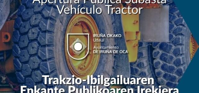 EXPEDIENTE: Subasta vehículo tractorAPERTURA PUBLICA SUBASTALUGAR: Salón de Plenos del Ayuntamiento de Iruña de OcaDIA: 21 de agosto de 2025HORARIO: 10:00 horasLo que se hace público para general conocimiento