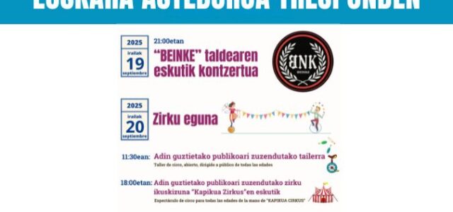 Irailak 19 21:00etan “BEINKE” taldearen eskutik kontzertua Irailak 20 | Zirku eguna 11:30ean: Adin guztietako publikoari zuzendutako tailerra. Taller de circo, abierto, dirigido a público de todas las edades. 18:00etan: […]