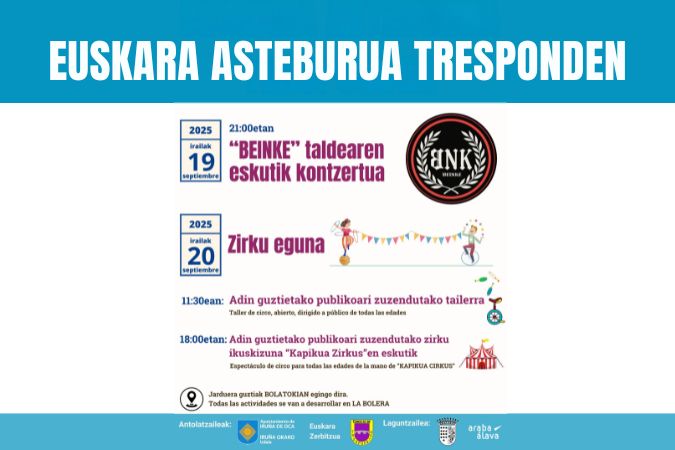 Irailak 19 21:00etan “BEINKE” taldearen eskutik kontzertua Irailak 20 | Zirku eguna 11:30ean: Adin guztietako publikoari zuzendutako tailerra. Taller de circo, abierto, dirigido a público de todas las edades. 18:00etan: […]