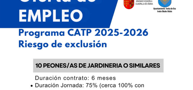 10 PEONES/AS DE JARDINERÍA O SIMILARESDuración de contrato: 6 mesesDuración Jornada: 75% (cerca 100% con formación y orientación)Lugar de trabajo: Iruña de OcaSueldo mensual bruto: 1.267€ aprox.Fecha de incorporación: 01/02/2026Código […]