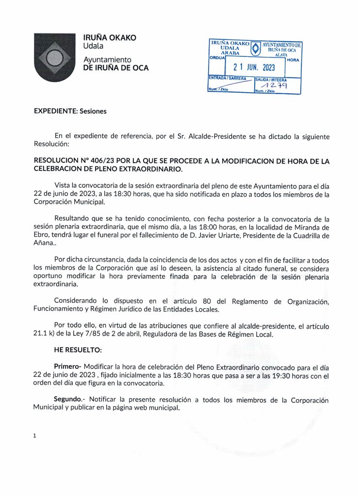 RESOLUCION Nº 406/23 POR LA QUE SE PROCEDE A LA MODIFICACION DE HORA DE LA CELEBRACION DE PLENO EXTRAORDINARIO.