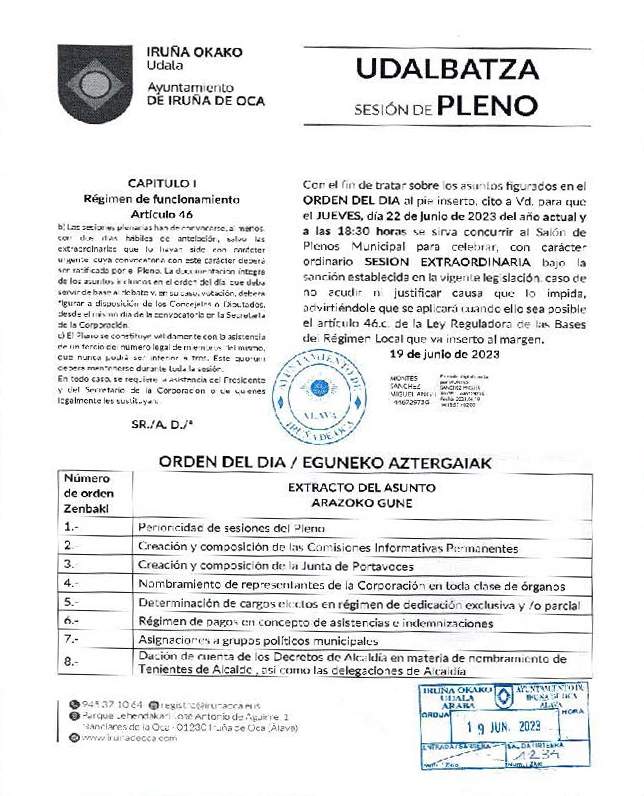 Vista la convocatoria de la sesión extraordinaria del pleno de este Ayuntamiento para el día 22 de junio de 2023, a las 18:30 horas, que ha sido notificada en plazo a todos los miembros de la Corporación Municipal.