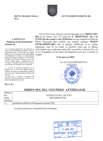 El próximo miércoles 1 de junio tendrá lugar en la sala de plenos del Ayuntamiento de Iruña de Oca, una sesión plenaria extraordinaria con el siguiente orden del día: