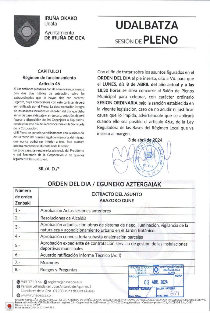 El próximo LUNES 8 de abril de 2024 a las 18:30 horas, en el salón de plenos del Ayuntamiento, se celebrará un pleno ordinario con el siguiente orden del día: