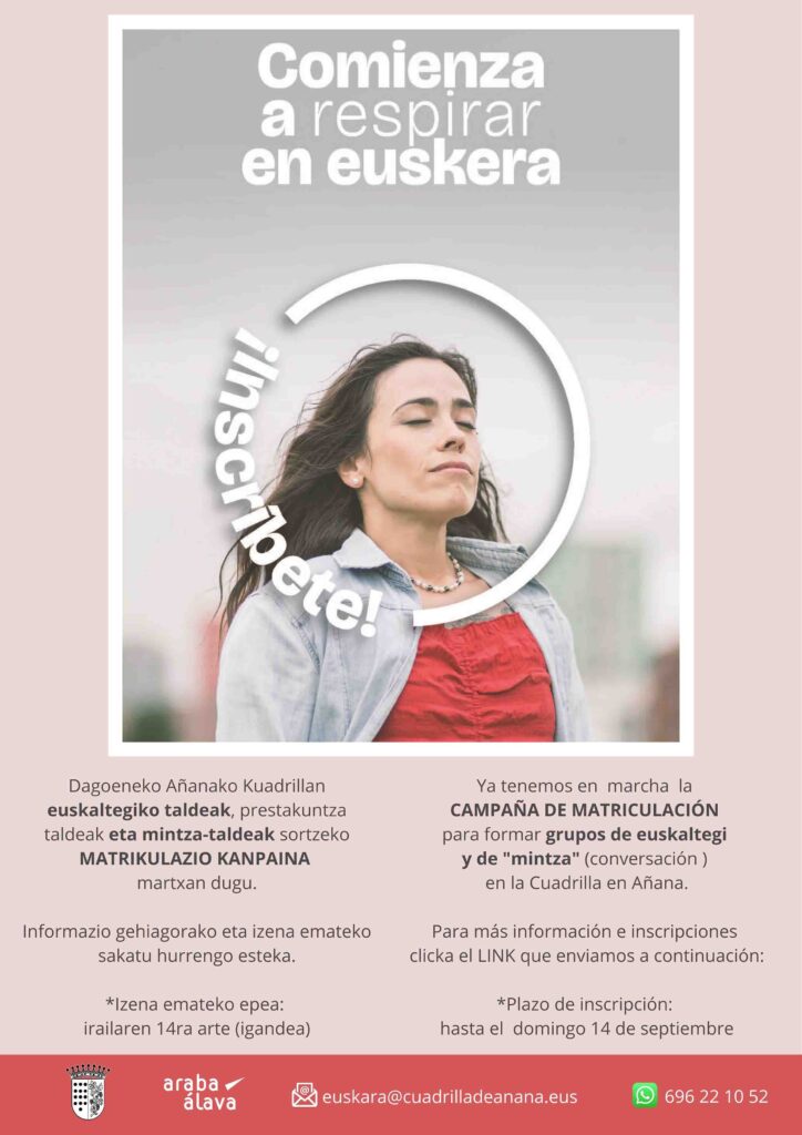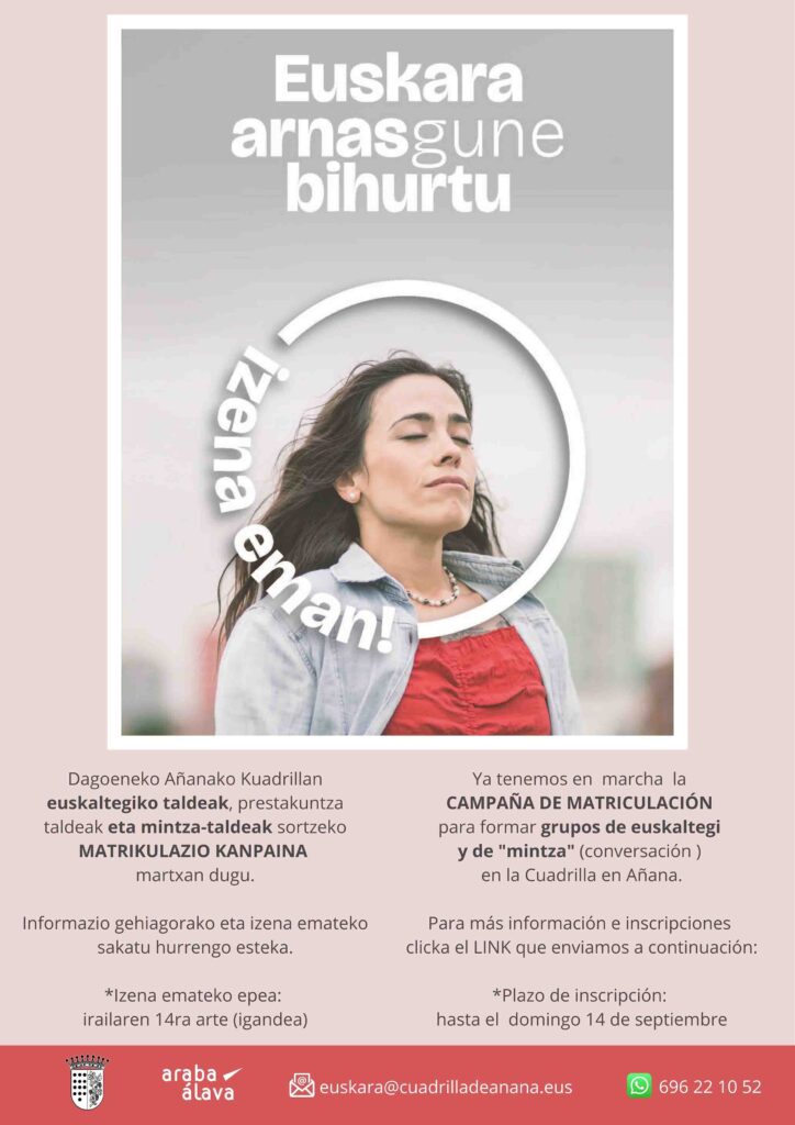 Ya está en marcha la CAMPAÑA DE MATRICULACIÓN para formar grupos de euskaltegui y de «mintza» (conveersación) en la Cuadrilla de Añana. Para más información e inscripciones haz click sobre el botón: