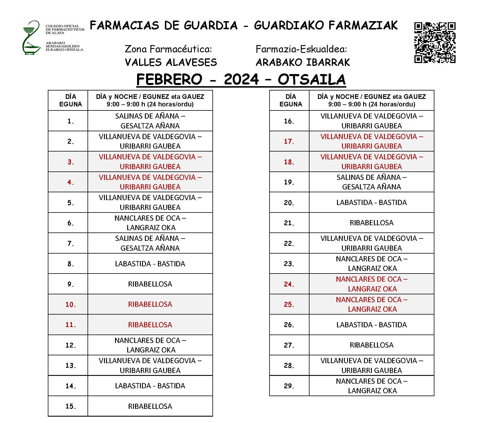 El Colegio Oficial de Farmacéuticos de Álava, con el fin de facilitar el acceso de la información de las farmacias de guardia de la zona, nos remite el cartel correspondiente a FEBRERO de 2024.