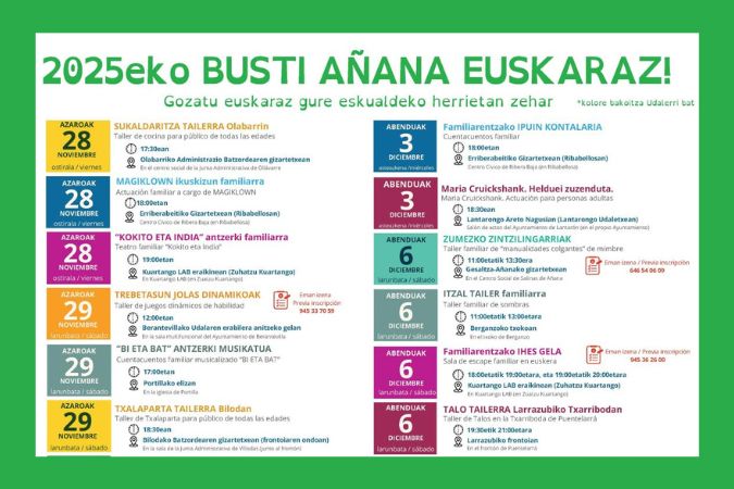 Gozatu euskaraz gure eskualdeko herrietan zehar. Talleres, magia, teatro, cuentacuentos, danza y mucho más para disfrutar del euskera en familia por toda la Cuadrilla de